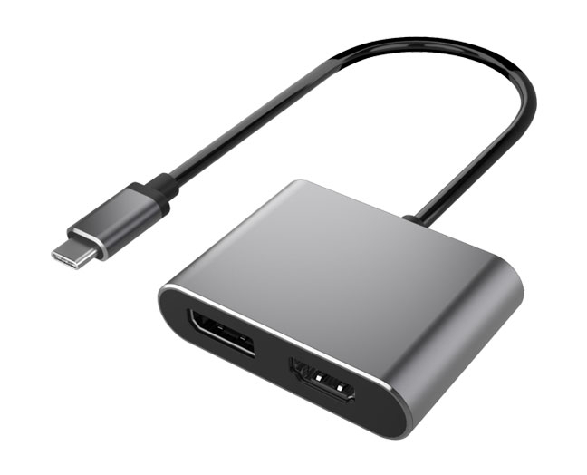 本产品为二合一高清视频转接器,,,,,,,,USB-C接口支持DP alt mode 信号输入,,,,,,,,HDMI和DP信号输出,,,,,,,,两个口都支持最高4K/60Hz区分率,,,,,,,,不支持两口同时显示。。。。。。。将USB-C公头插入电脑/平板等有USB TYPE C接口的主机装备,,,,,,,,再用HDMI/DP线毗连有HDMI/DP接口的显示器/投影仪等装备,,,,,,,,即可将电脑的界面复制到显示器上面。。。。。。。一个二合一转接器可提供两种选择兼容差别接口的装备。。。。。。。
